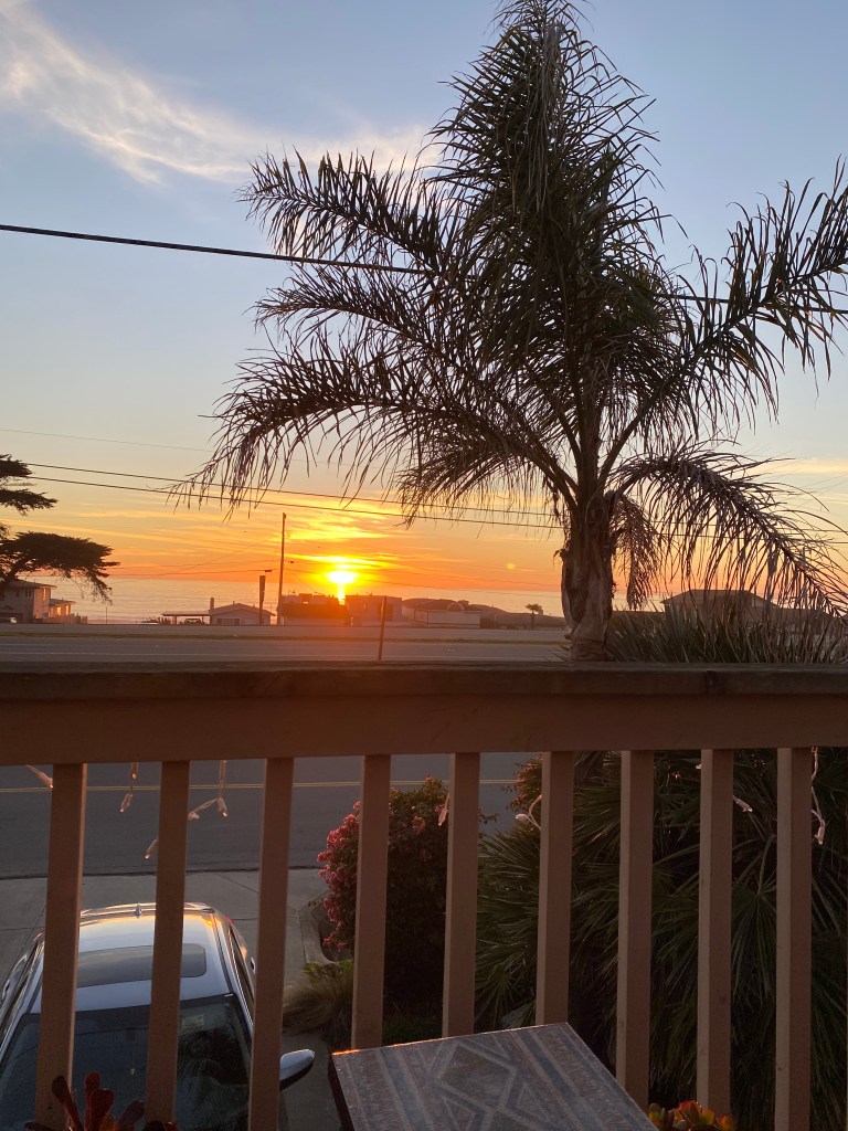 I am one of the lucky ones who has a view of the Pacific Ocean from my living room window. Our home was purchased 24 years ago when it was doable on teacher salaries. I sit out on my upstairs deck and watch the waves curl angrily on windy days and gently on mild spring and summer days. The year the whales came through and put on a show caused drivers to pull over to watch the majestic scene. The sunsets are as if the sky spilled out orange, red and yellow paint while the sun creates the light show. Often it brings me to tears of gratitude for this little tropical haven.