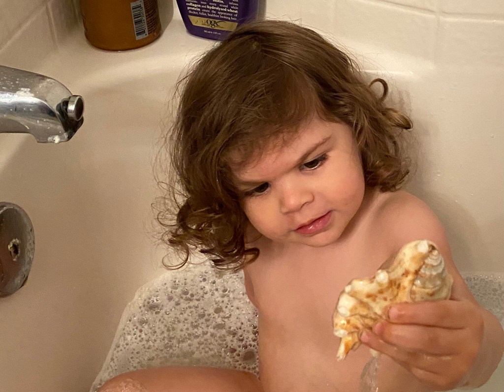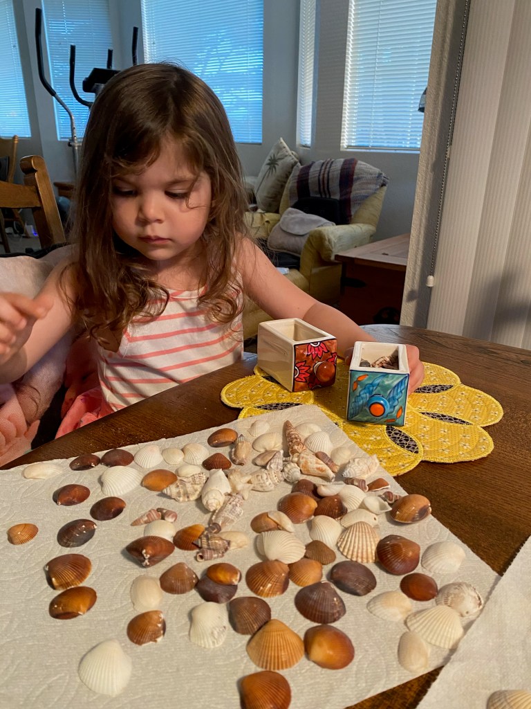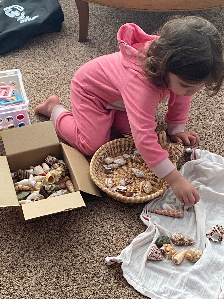 I have, and two toy boxes of toys, she prefers to sort my seashells. We spent more than an hour deciding how to sort them (color, size, uniqueness). When it was bath time, she insisted on taking some shells into the tub. Why not? She extended her curiosity to include how seashells are home to some tiny creatures and how they travel from one place to another. Bonus: I even got to shampoo her hair.