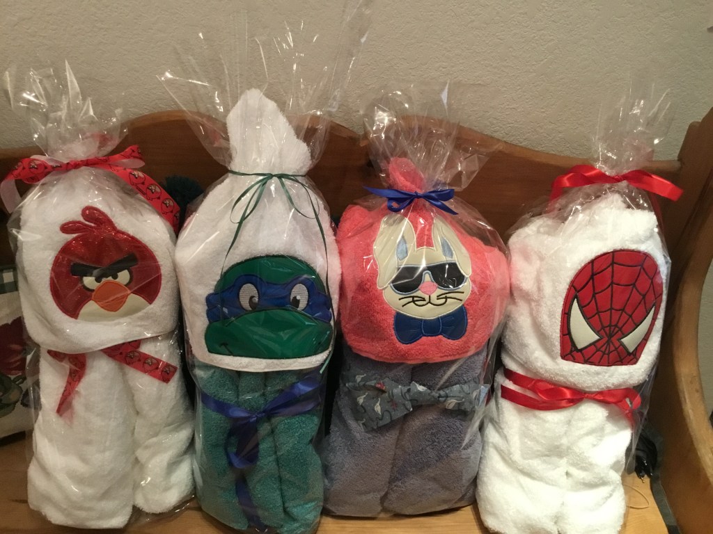 I make hooded bath towels for kids of all ages. If you have a special character in mind, email me (Caysunset@gmail.com) and I will see if I can make it for you. $30 each and mailing within US is an additional $10.