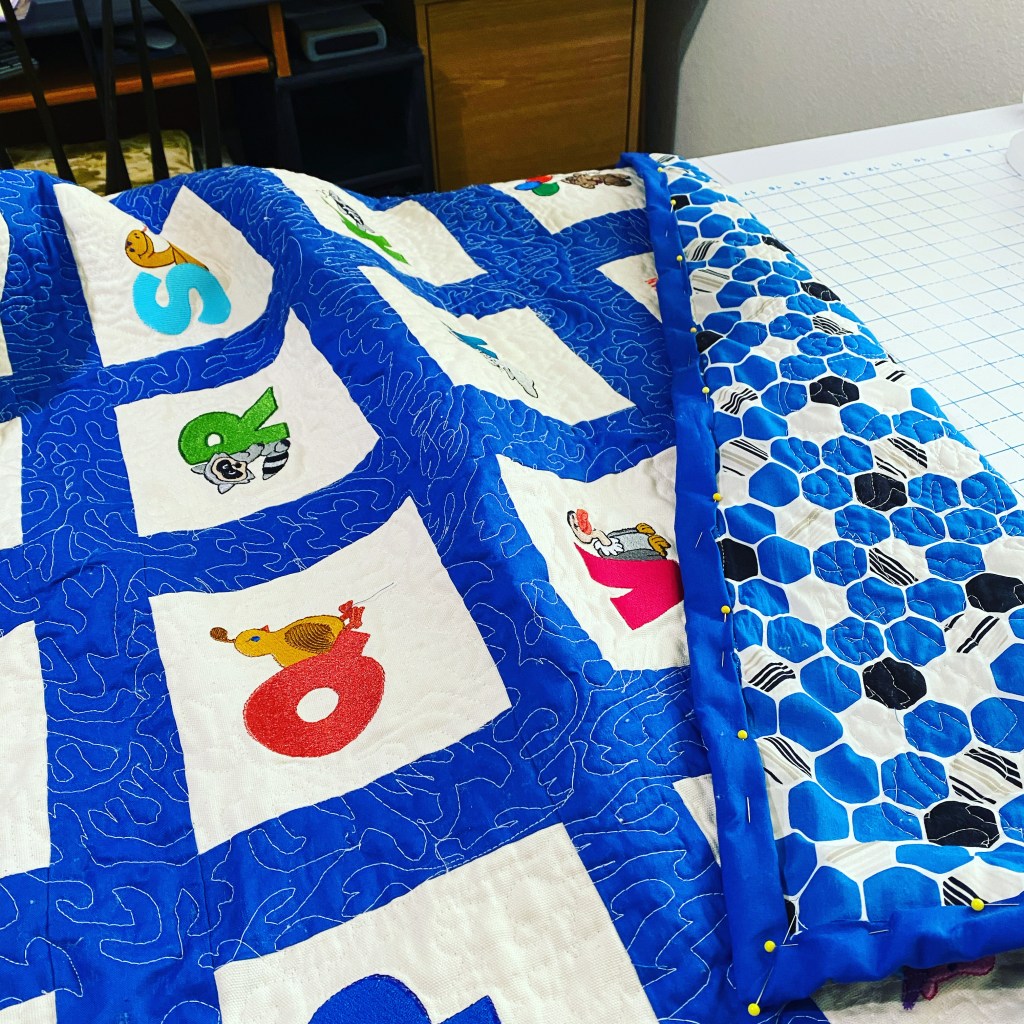 It gives me great joy to put my love into each quilt. They sleep under a blanket of love. I have a Babylock Spirit Embroidery Machine that I use for the designs.