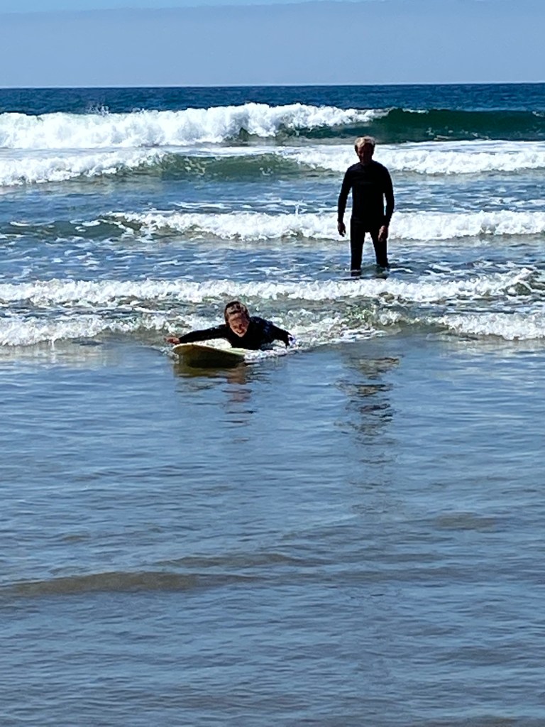 Our granddaughter from Wales wanted to learn how to surf and she wanted her grandpa, an accomplished surfer, to teach her. He got her outfitted with a wetsuit and spent time on the sand prepping her and acquainting her with the basics. Her little sister was content playing near the shore.
