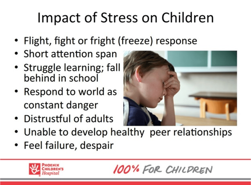 Neurobiologic Effects of Trauma : Disrupted neuro-development, Difficulty controlling anger-rage, Hallucinations, Depression, Panic reactions, Anxiety, Multiple (6+) somatic problems, Sleep problems, Impaired memory, Flashbacks, Dissociation