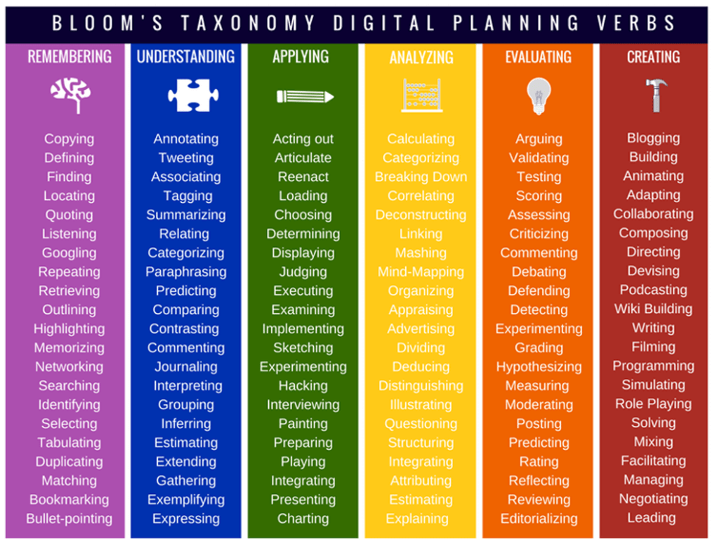 Remember, understand, apply, analyze, evaluate, create. Use robust verbs in your lesson plans. What will the students do?